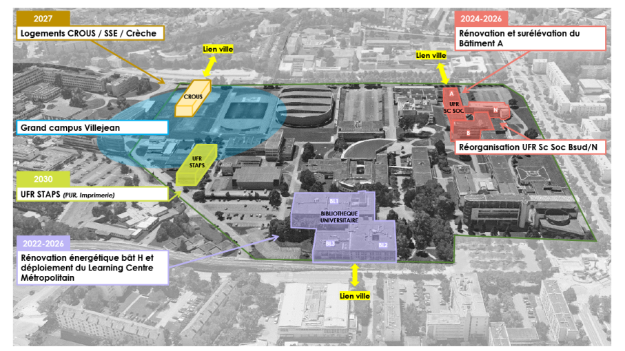 - Le bâtiment A occupé par l’UFR Sciences Sociales : l’opération prévoit une rénovation globale (énergétique, fonctionnelle et technique) du bâtiment et une surélévation de plus de 1000 mètres carrés pour créer de nouvelles salles d’enseignement et accueillir de nouveaux services afin d’anticiper les futures opérations immobilières. Ce sera l’occasion de repenser les pratiques de recherche, pédagogie et documentation et impliquera de réorganiser les fonctions présentes dans le bâtiment N et la partie sud du bâtiment B. La livraison est prévue pour 2026.