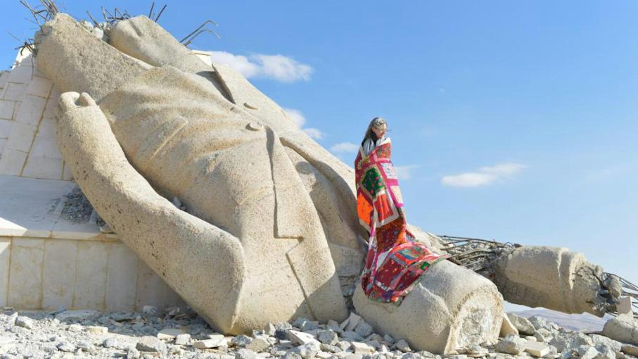 Debout sur la statue renversée de Hafez Al-Assad, qui surplombait la ville de Deir Atiyeh, dans le Qalamoun (ouest du pays)… La Chute, de Mohamad Khayata, installation-photo. Mohamad Khayata, Fourni par l'auteur