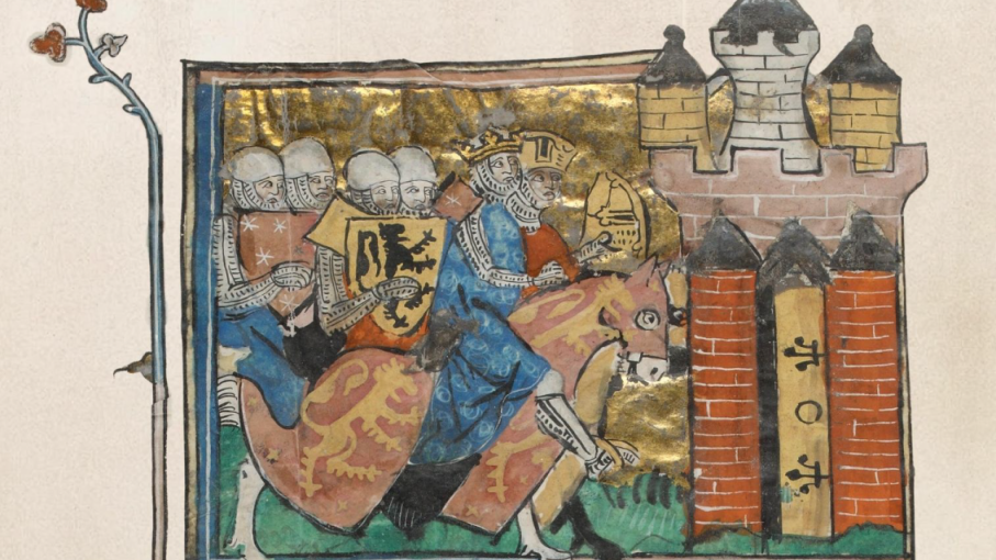Miniature : “Arrivée d’Emenidus à la Clere Tor” Artus de Bretagne BnF fr. 761, f. 138v (Gallica)