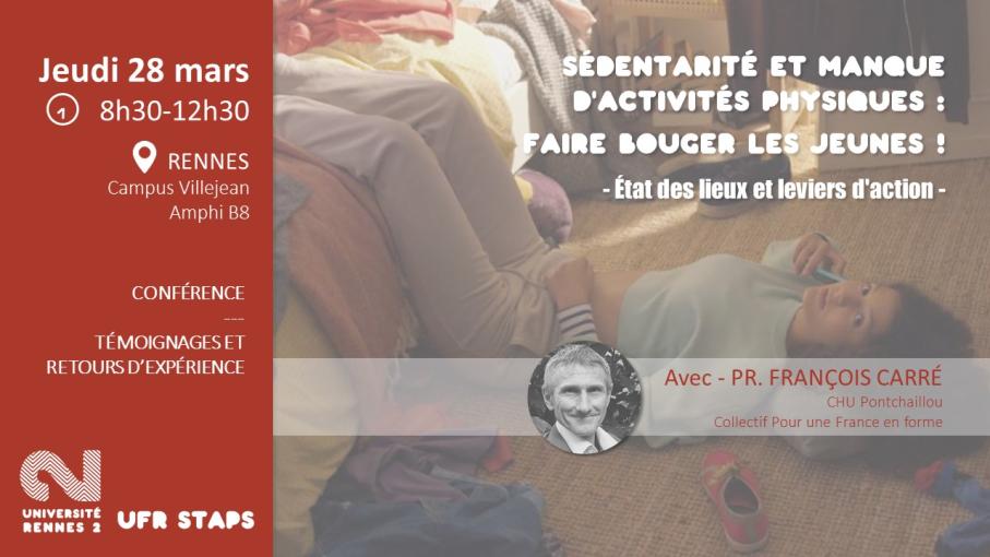 Professeur François Carré, du CHU Pontchaillou, présentera l'étude "Inversons les courbes". Cette étude, soutenue par la fondation Matmut-Paul Benetot et par la fédération française de cardiologie, vise à évaluer le niveau d’endurance cardio-respiratoire d’élèves de 6e issus de 3 régions (Bretagne, Hauts de France, Auvergne-Rhône-Alpes) et prouver l’efficacité d’une application support pour les enseignants d’EPS pour développer l’endurance cardio-respiratoire des élèves en EPS.