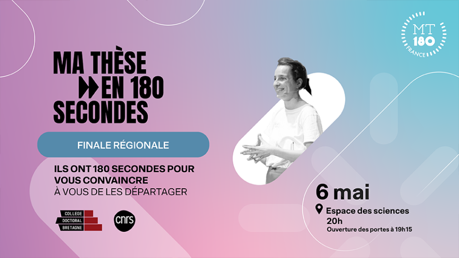 Le 6 mai 2025, 16 doctorantes et doctorants venus de l'Université de Bretagne Occidentale, l'Université Bretagne Sud, l'Institut Agro Rennes-Angers, l'Université de Rennes et l'Université Rennes 2 monteront sur scène à l'Espace des sciences aux Champs Libres à Rennes et présenteront leurs thèses dans des domaines très variés en 3 minutes, à l'aide d'un seul visuel.